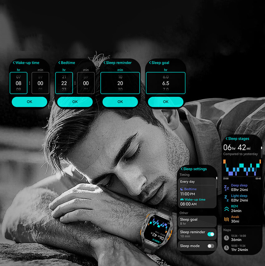 Unterstützt Schlaf-Erinnerungen, Weckalarm und Schlafziele. Der Schlafmodus liefert Daten zu Tiefschlaf, Leichtschlaf, REM-Phasen und Wachzeiten – zur umfassenden Analyse deiner Schlafqualität.